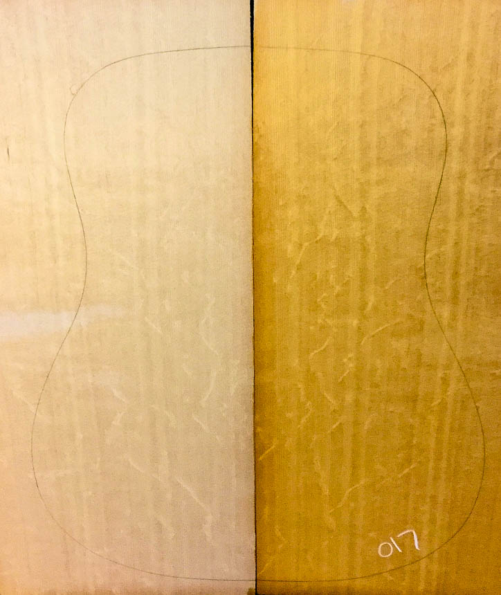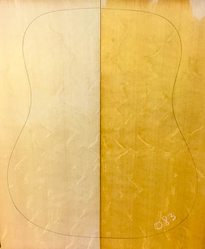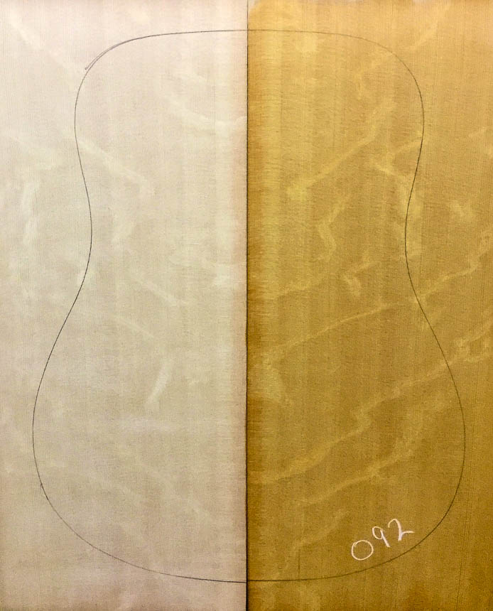 Tonally, these sets are on par with my Premium soundboards, but they have exceptional grain patterns that set them apart, making them Master Grade. Most of this is bear claw figure, which is named because someone once envisioned a bear out in the forest scratching at the tree and leaving claw marks. This figure, of course, is a completely natural phenomenon, but it’s fun to think of a bear wandering around the woods, eyeing a trunk to scratch on. It reminds us that the woods we use to make guitars were once alive and breathing. Quilted figure in spruce is much more subtle. It will have a waviness and depth to the sheen.